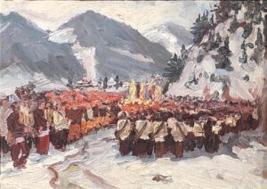 В експозиції – роботи митців ХІХ – початку ХХ ст.: С. Васильківський, І. Труш, О. Новаківський, М. Беркос, М. Ткаченко, П. Левченко, О. Кульчицька, М. Мороз, М. Сосенко. А також візії яскравих репрезентантів мистецтва середини ХХ–ХХІ ст.: Р. Сельський, С. Шишко, К. Звіринський, З. Флінта, М. Андрущенко, П. Грегорійчук, Б. Сорока, В. Патик, Р. Петрук, М. Яців, М. Білас, Я. Мотика, І. Марчук, В. Риботицький, Р. Романишин, О. Потапенко, С. Шабатура, О. Крип’якевич, О. Безпалків, П. Маркович, М. Демцю, Б. Буряк, П. Сипняк, Л. Квик, А. Криволап, Я. Ткачук, Д. Альошкіна, Т. Барабаш, та ін.